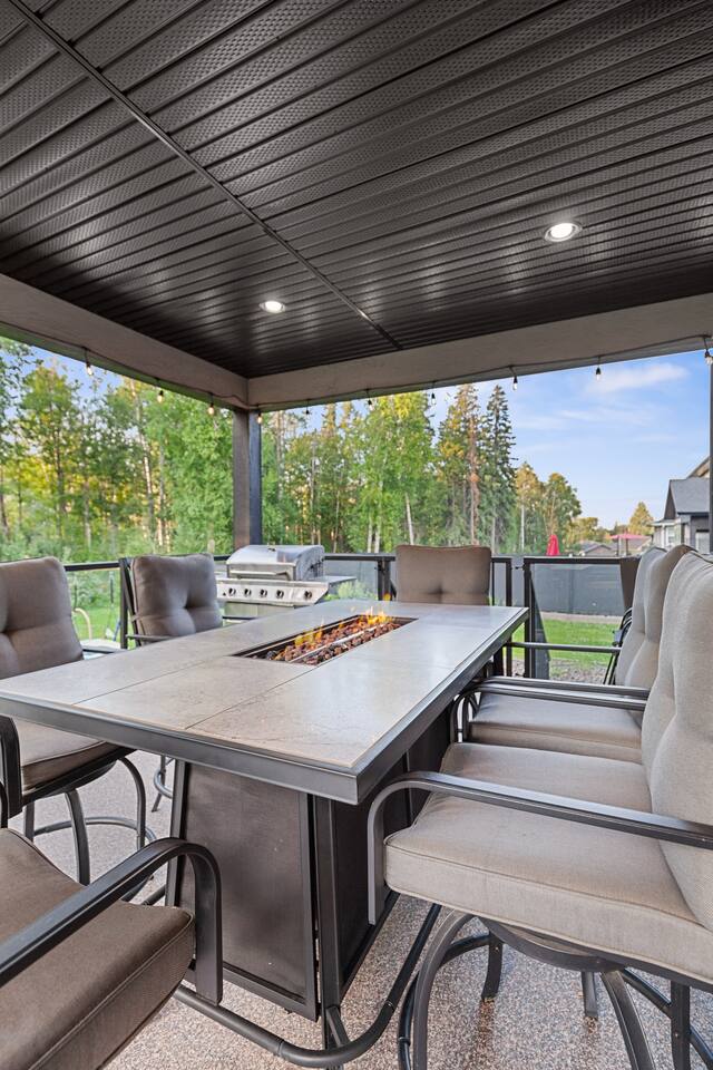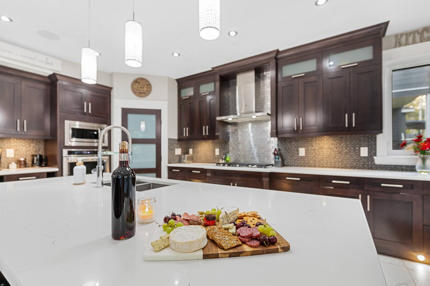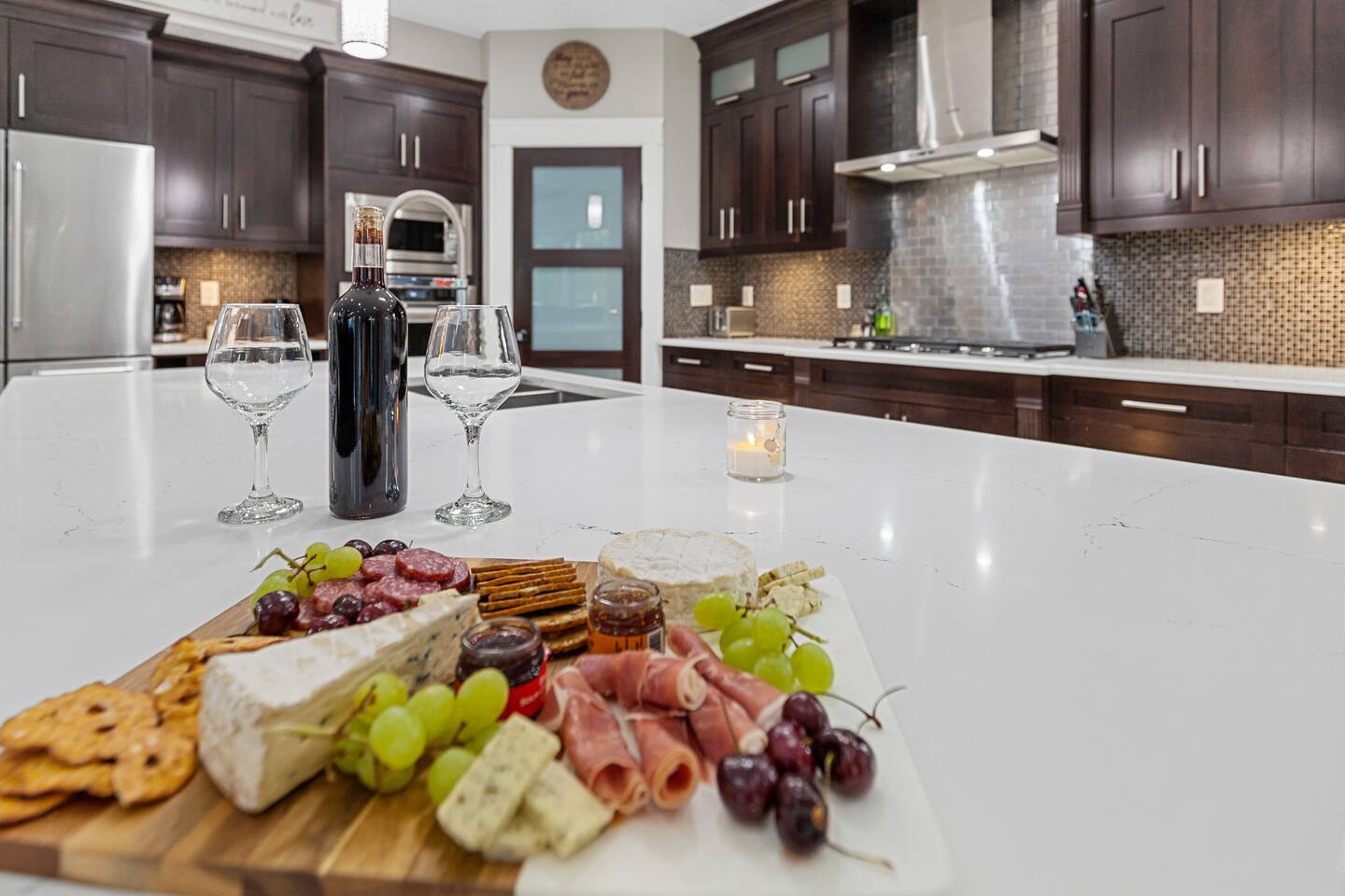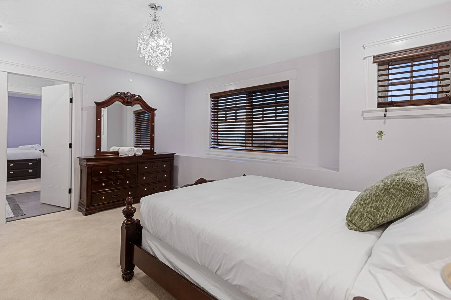 ✨ Key Features ☀Sleeps 10 in comfort: 1 King, 3 Queens, 2 Twins ☀4 bathrooms: Includes a spa-inspired master bath with steam shower, body jets, deep stone-framed soaker tub, and dual vanities ☀Chef’s kitchen: Gas range, double ovens, large quartz island, and formal dining for 11 ☀Cozy living room: Floor-to-ceiling stone fireplace, leather sofas, 65” Smart TV, and board games ☀Dedicated office + high-speed Wi-Fi: Ideal for remote work and extended stays ☀Ample parking: Private driveway for 3 vehicles plus street parking ☀Massive backyard: Fenced, private, with BBQ, fire pit, and forest views 🛏 Bedrooms Primary Suite King bed with plush linens under a tray ceiling with accent lighting and blackout curtains. Enjoy a walk-in closet and a spa-like en suite bath for the ultimate retreat. Second Bedroom Queen bed with crisp bedding, soft lighting, blackout blinds, and chic decor — a peaceful hideaway. Third & Fourth Bedrooms Inviting queen setups with full storage and plenty of natural light. Fifth Bedroom Two twin beds — perfect for kids, teens, or additional guests. 🛁 Bathrooms Indulge in a luxury bathing experience: Rainfall walk-in shower with river rock floor, body sprays, steam function, and built-in bench Deep soaker tub with stone surround in the master Dual vanities with plush towels and eco-friendly toiletries Stylish powder room with vessel sink and gold hardware 🍽 Kitchen & Dining Chef’s Kitchen Gas stovetop, double wall ovens, large quartz island, full cookware set, and coffee bar with drip coffee. Dining Area Formal seating for 11 under a chandelier and coffered ceiling — perfect for family feasts or holiday meals. 🛋 Living Spaces Relax in the cozy yet elegant living room: Floor-to-ceiling stone fireplace Massive leather sofas and soft throws 65” Smart TV Board games for family fun 💼 Workspace Dedicated home office with ergonomic desk, bright lighting, and high-speed internet — ideal for business travelers and remote work. 🌲 Outdoor Space Private fenced yard with seating area, fire table, BBQ, and a fire pit — all surrounded by trees for a secluded, serene feel. 📍 Location Highlights Downtown Prince George – 10 min Restaurants & cafés – 7 min UHNBC – 12 min Shopping & entertainment – 8–10 min Trails & parks – 5 min YXS Airport – 15–17 min